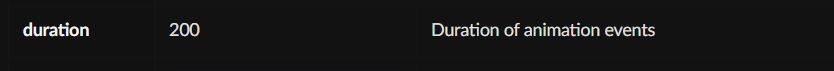 이런 식으로 각 기능들이 있다. 가운데는 default value이고, 오른쪽엔 설명, 왼쪽에는 해당 속성의 이름이 나와 있다. 즉 이 속성을 변경하고 싶으면 duration 값을 다르게 바꿔 주면 된다.