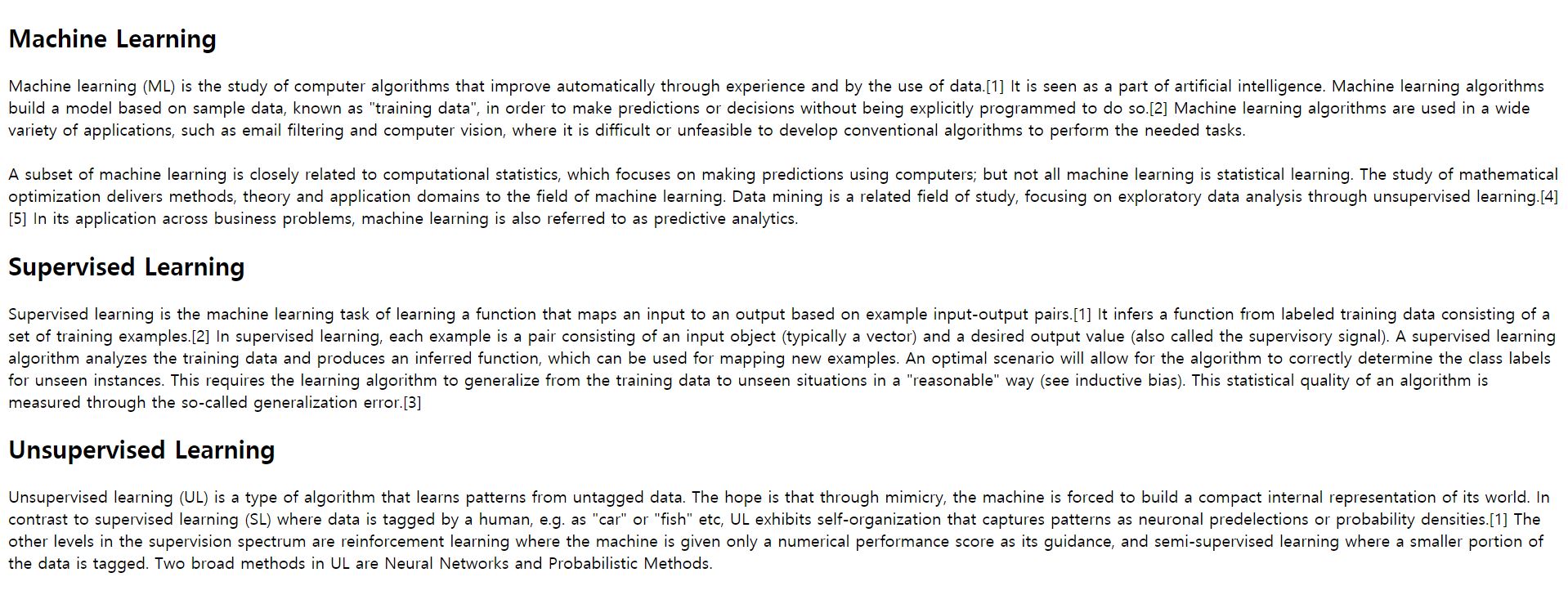 코드가 이런 식으로 나오는데, Machine Learning 글 안에 단락은 <p> 태그로 구분되어 있고, 각 학습(Learning)의 종류는 <article>으로 구분되어 있다.
